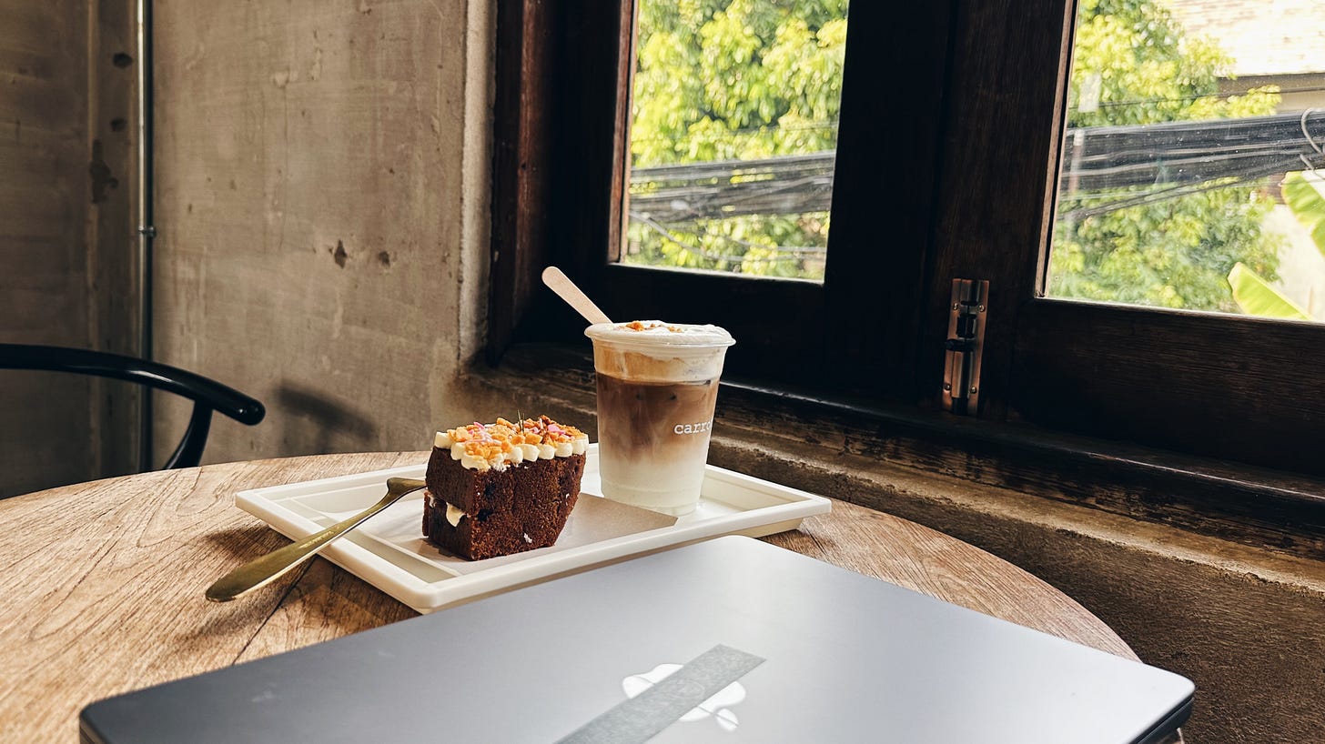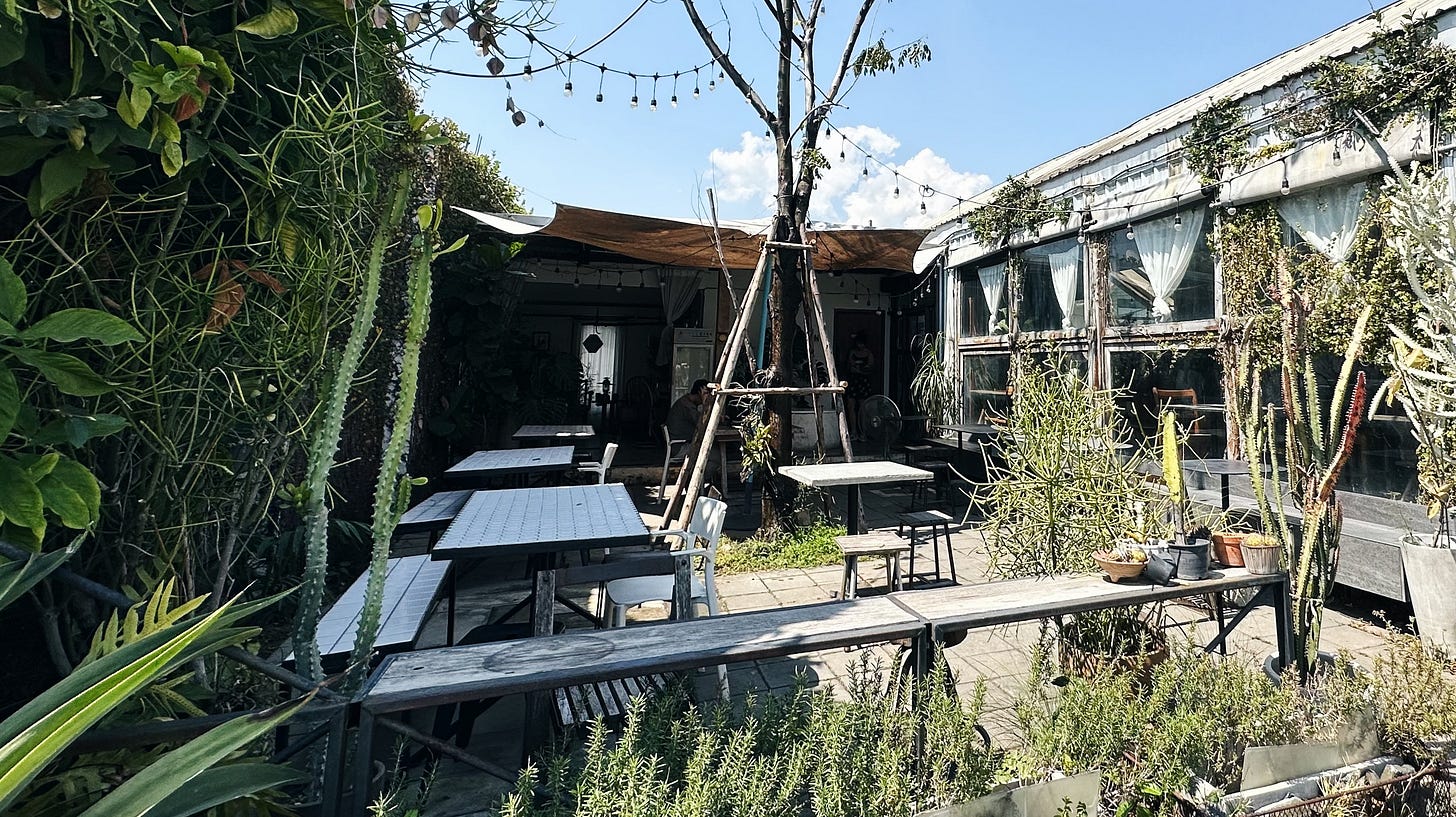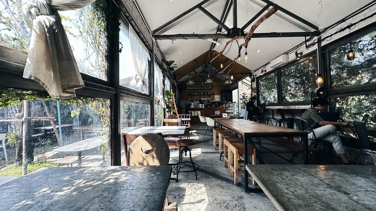 也沒說錯,旅遊就是花錢去體驗別人的日常。這個日常遍佈在清邁大小各處,街邊咖啡密度堪比 City Café,隨時都能來上一杯。不過也因為這麼稀鬆隨性,儘管咖啡廳多有特色,但普遍店面小且插座少,讓我在以工作用途導向做選擇時困難許多。