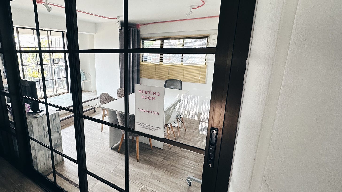 這間強項在附設免費使用的個人 Skype Room,更有價格實惠(100 THB/hr)的會議室能租用。環繞整個二樓的座位全部附有插座,完全是為了店內這些數位遠端工作的顧客量身打造。餐飲本身簡單但平價,是個用少少花費就能換來良好工作空間的好去處。